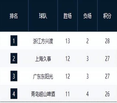 黑马青岛队以80-67轻松击败吉林队,收获3连胜,战绩来到11胜4负,成功重返积分榜前4,展现复苏势头。山东队则是主场以大比分战胜另一匹黑马宁波队,战绩变成10胜5负,升至积分榜第5位;北京队10胜4负紧随其后,排名第六。浙江队9胜6负排第七,宁波队8胜7负跌至第八,深圳队8胜6负位列第九。
